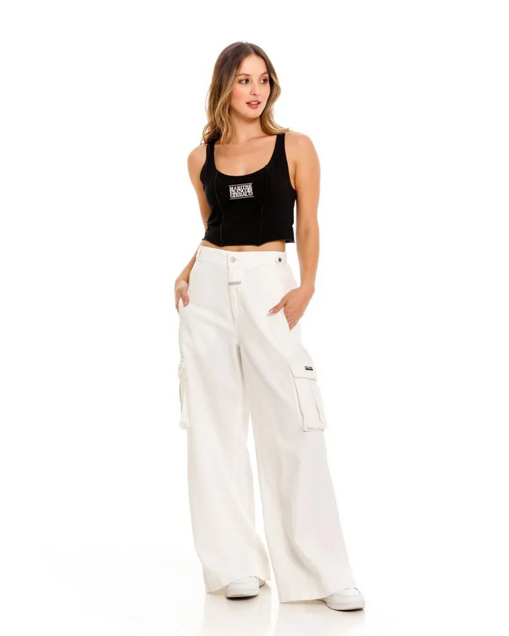 La modelo mide entre 1.70 y 1.75, la prenda superior es talla m y la prenda inferior es talla 8.