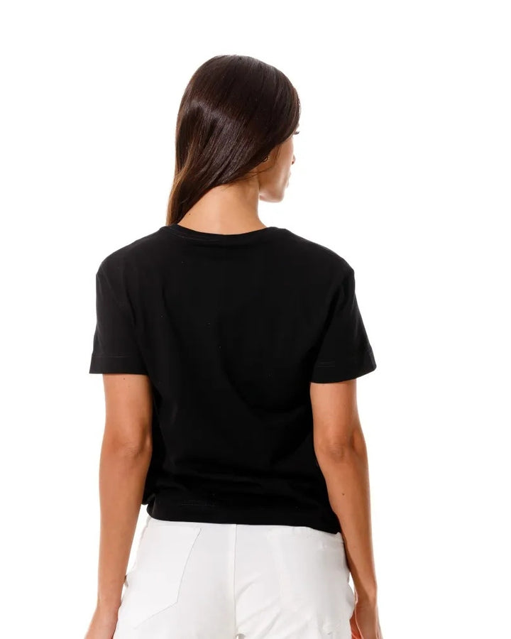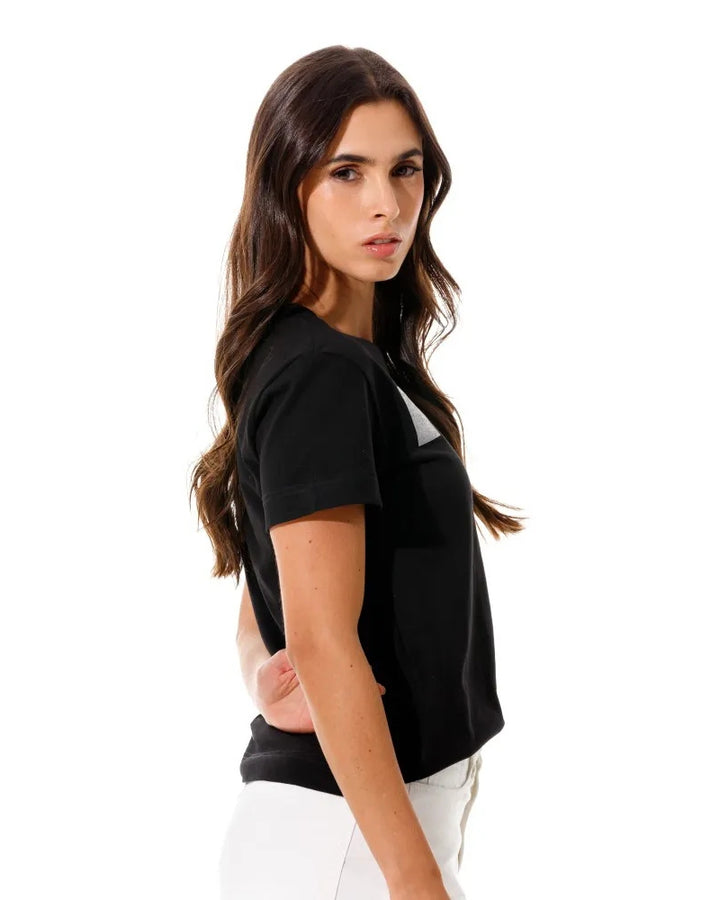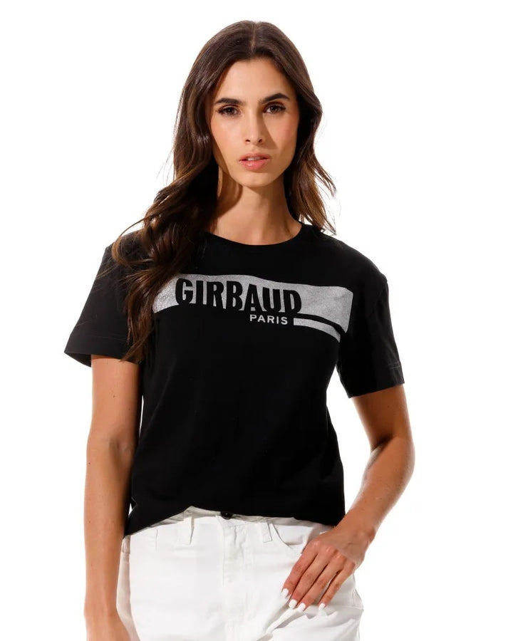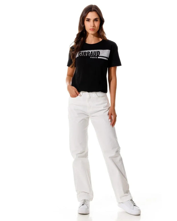 Camiseta con cuello redondo en rib, manga corta. Confeccionada en algodón de 180gr. Estampado en glitter plateado y dorado.