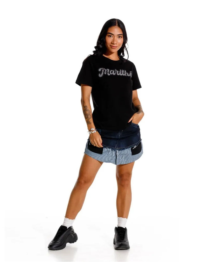 Camiseta Manga Corta Para Mujer Le Marithe Girbaud. La modelo mide entre 1.70 y 1.75, la prenda superior es talla s y la prenda inferior es talla 6.