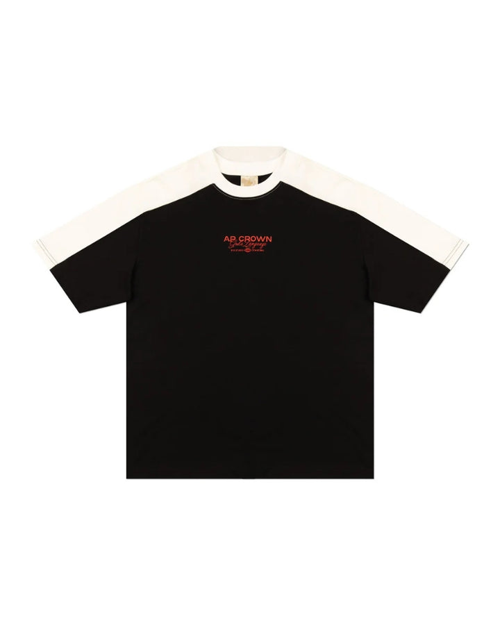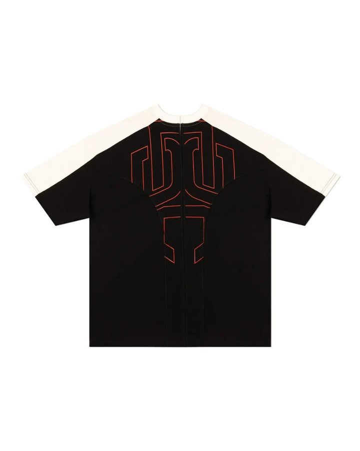 Camiseta negra 100% algodón con cortes en hombro y manga. Costuras orgánicas en su espalda, estampación con acentos en rojo. Regular fit 100% algodón.
