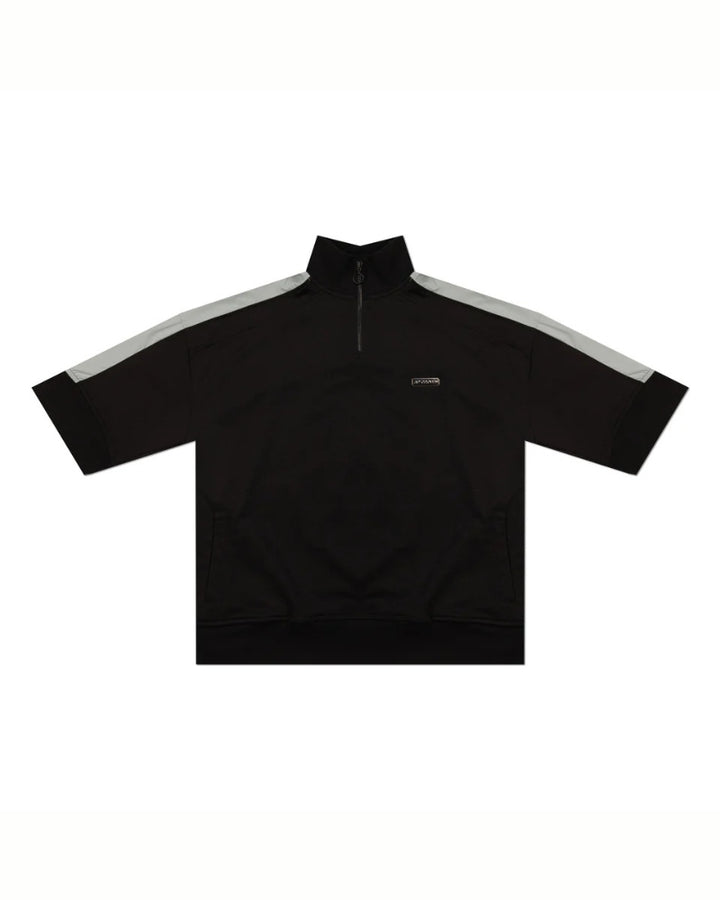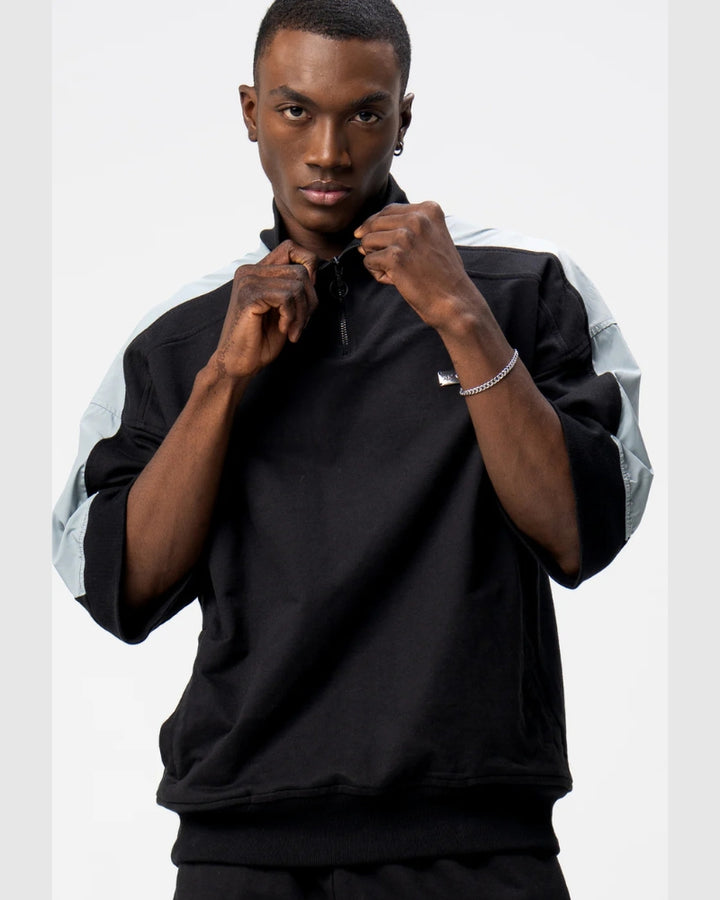 Pullover masculino de horma regular, 100% algodón con mangas 3/4 de largo, aplique metálico en su frente y cuello alto.