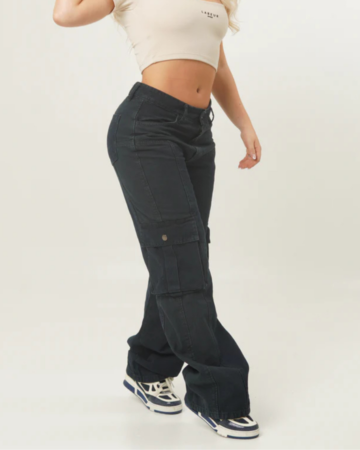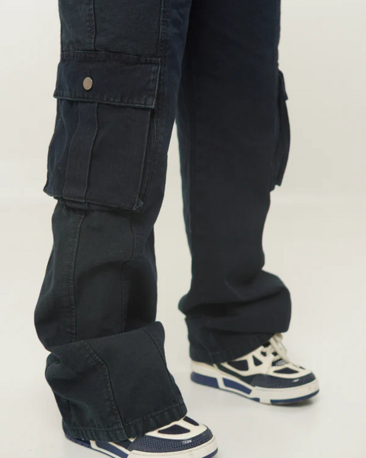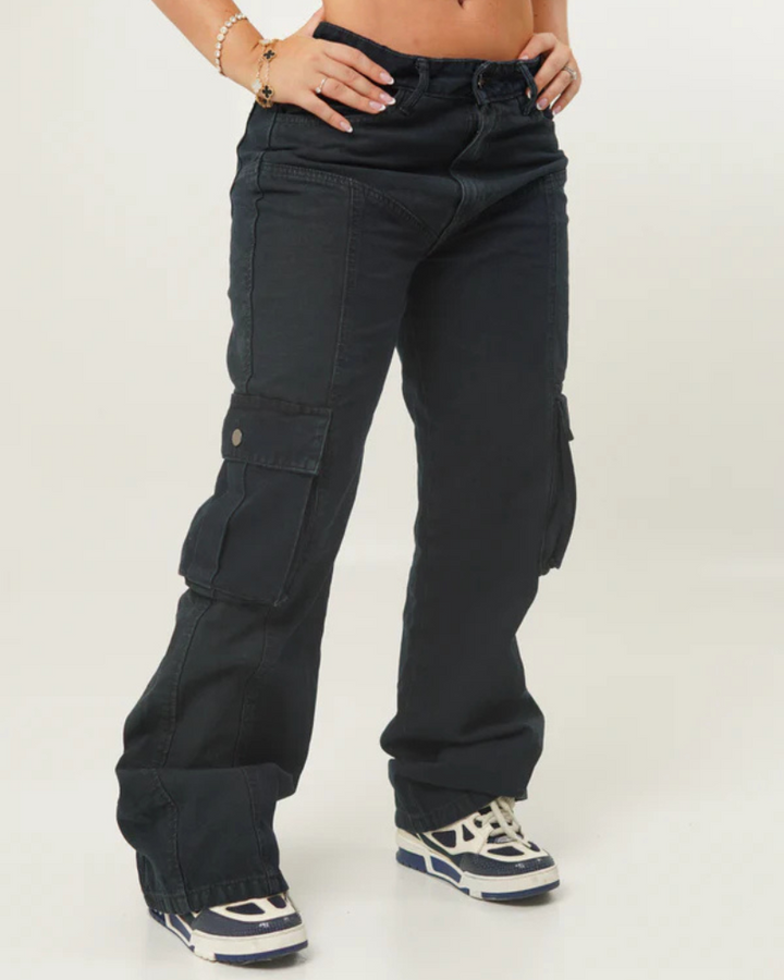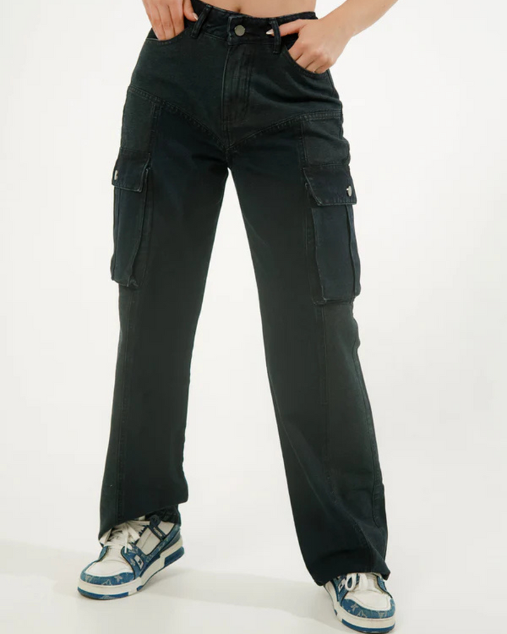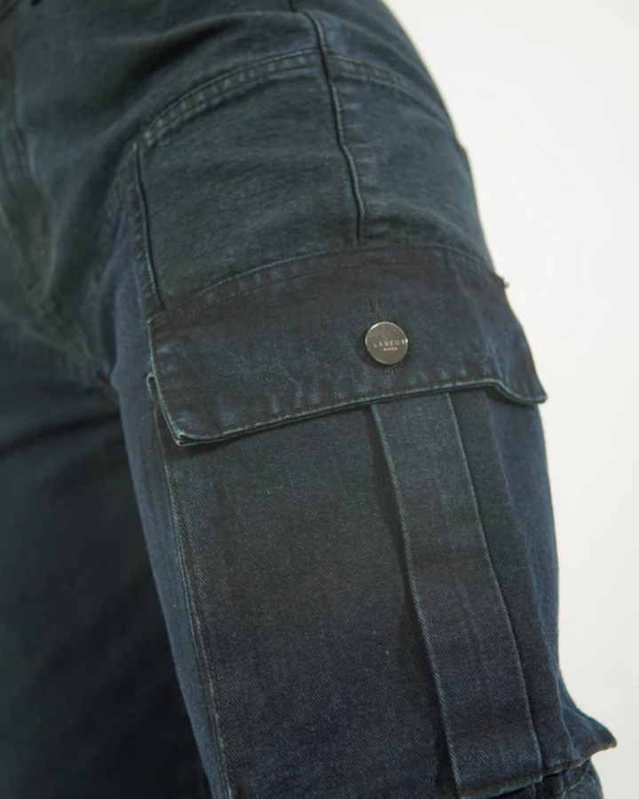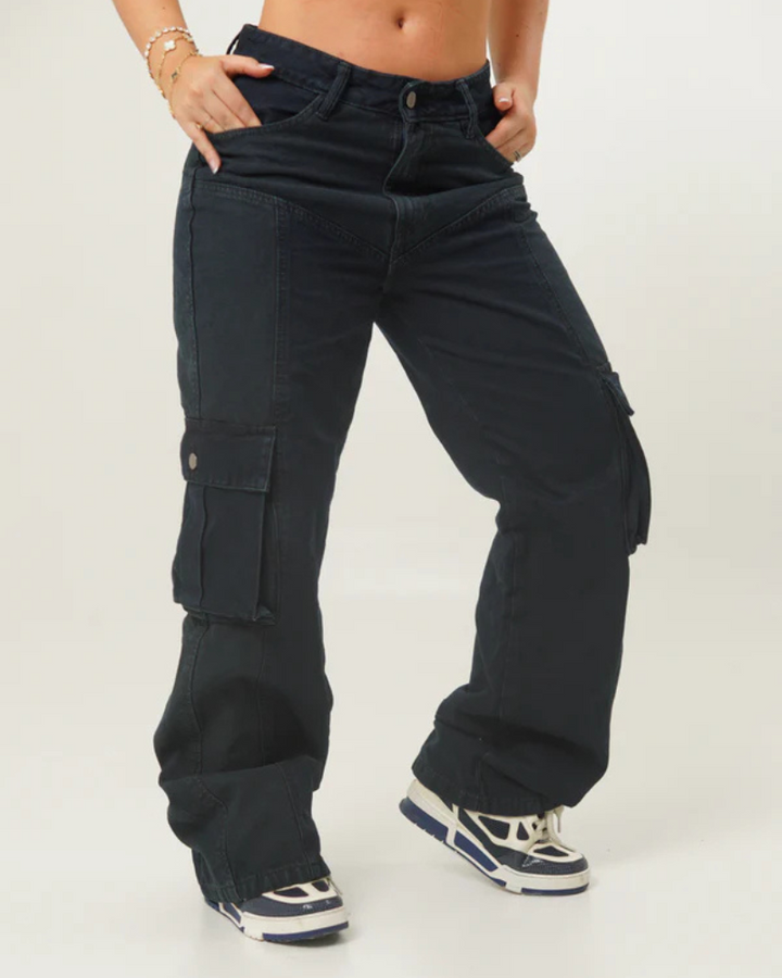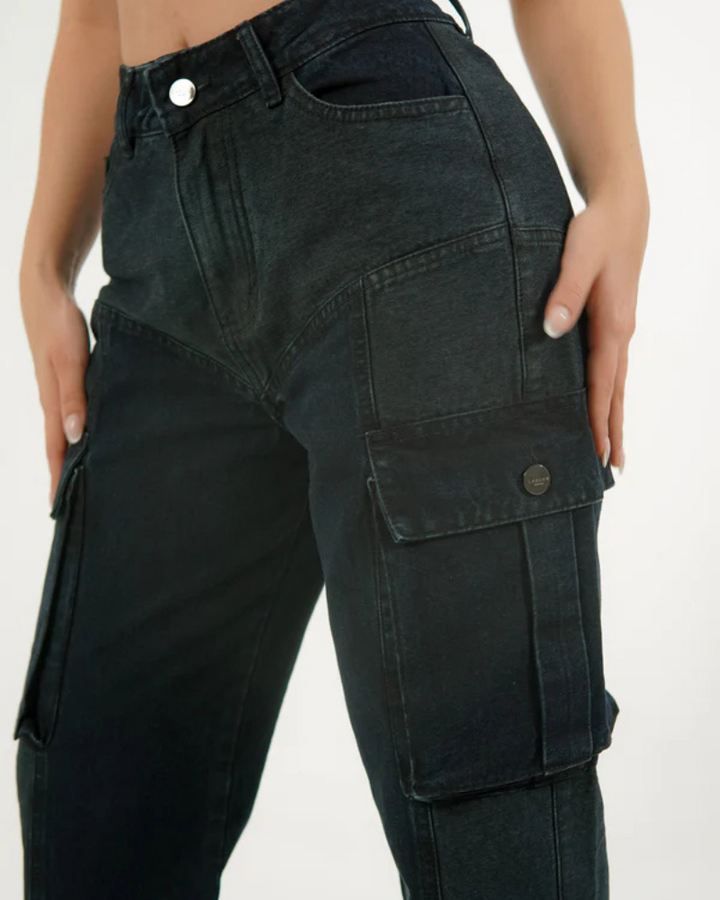 El Jean Dallas es tipo cargo; en dos tonalidades de azul oscuro combina cortes modernos y bolsillos laterales con botones plateados brandeados. Diseñado para destacar y ser el centro de todas las miradas.