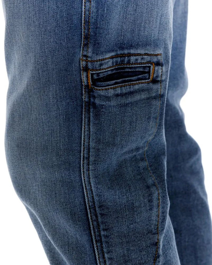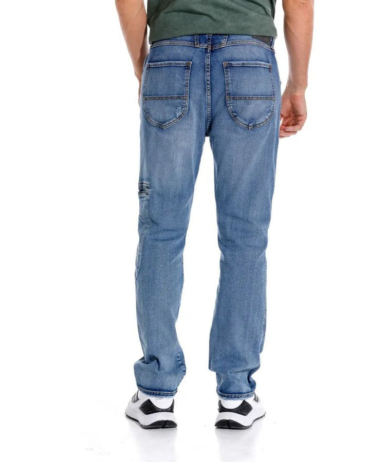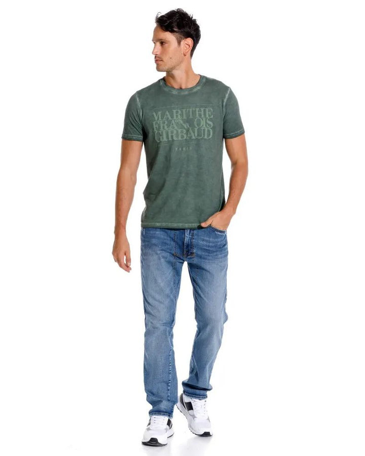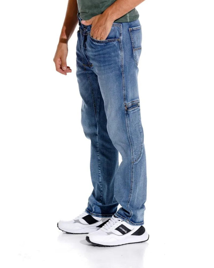 Jean tiro medio con bolsillos en X en delantero. Efecto lavado azul medio. Fit regular. Cierre frontal con cremallera y botón metálico.
