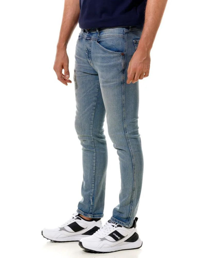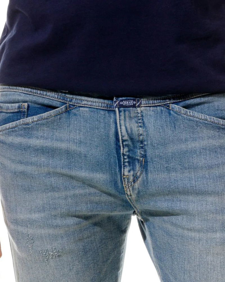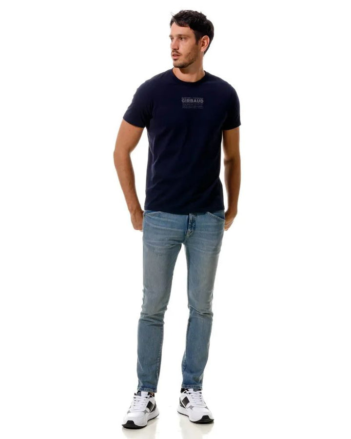 Jean tiro medio con 5 bolsillos . Efecto lavado azul medio. Fit slim. Cierre frontal con cremallera y botón metálico.
