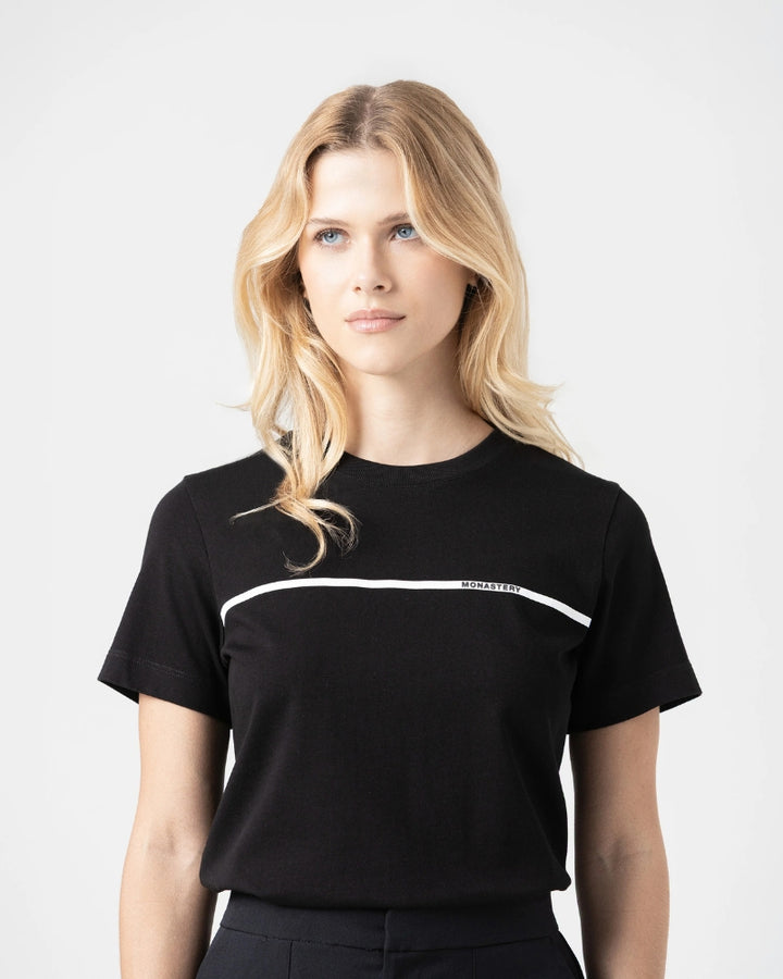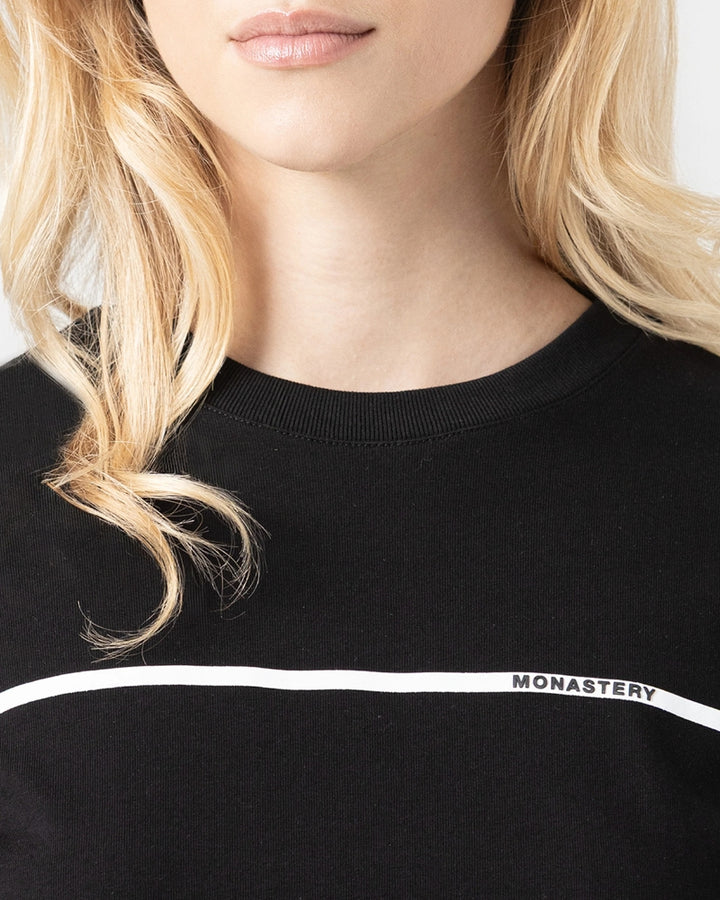 Camiseta femenina elaborada con una silueta regular pensado para el confort de la mujer Monastery, Molly es un diseño que lleva el logo Monastery en frente sobre una notable línea tono contraste la cual resalta de manera dinámica sobre el diseño, Elaborada en nuestra base textil Monastery, Algodón 100% exclusivo para la marca.