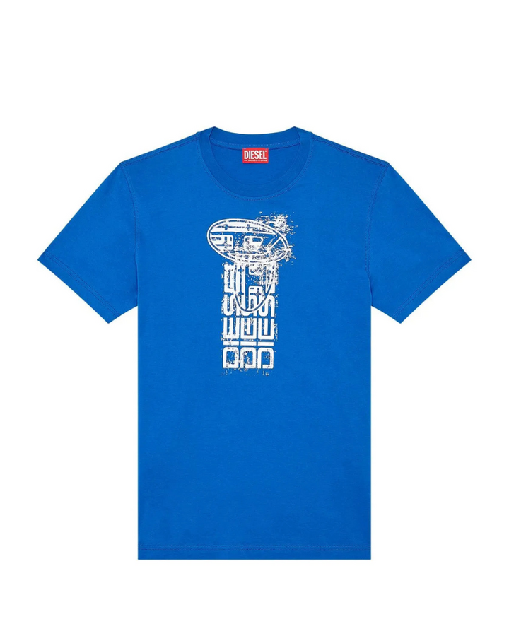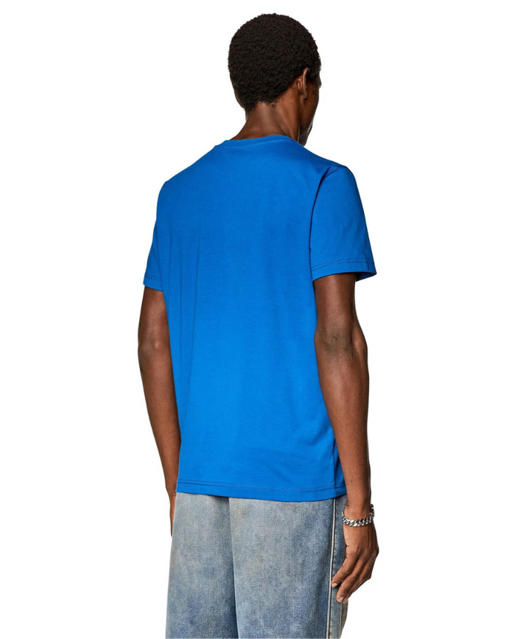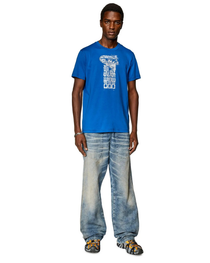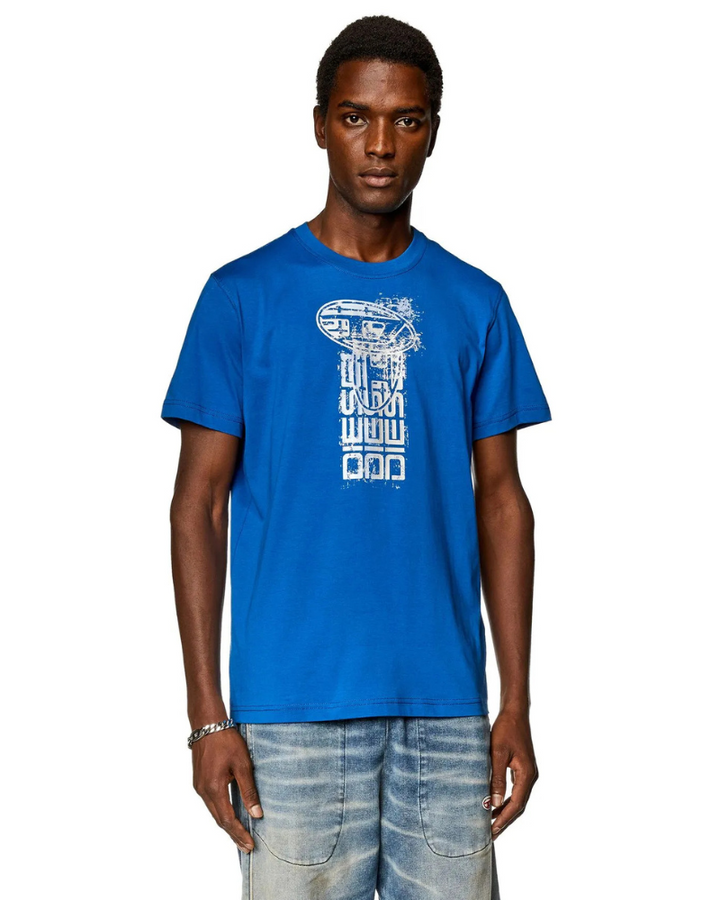 Esta camiseta de cuello redondo para hombre está confeccionada en tejido de algodón puro. de fit entallado, presenta en el pecho una combinación de logotipos de Diesel estampados en tinta metálica.