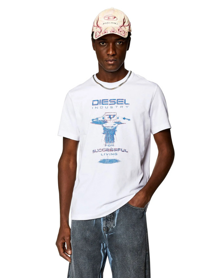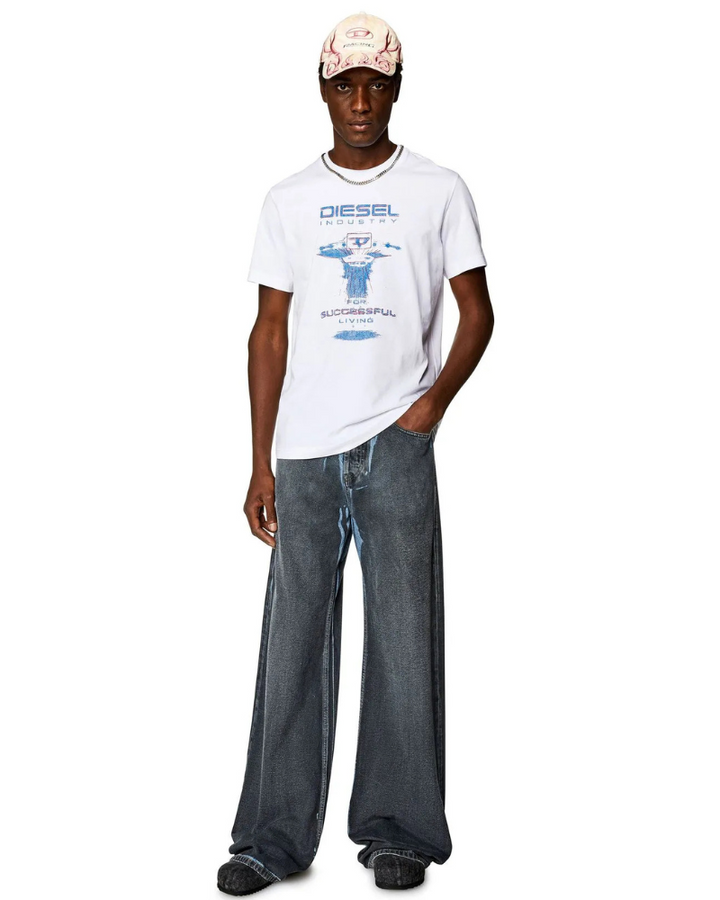 Camiseta de fit entallado para hombre Confeccionada en tejido de algodón puro. el pecho está adornado con un estampado de nave espacial de Diesel industry con un acabado en relieve y bordado en contraste.