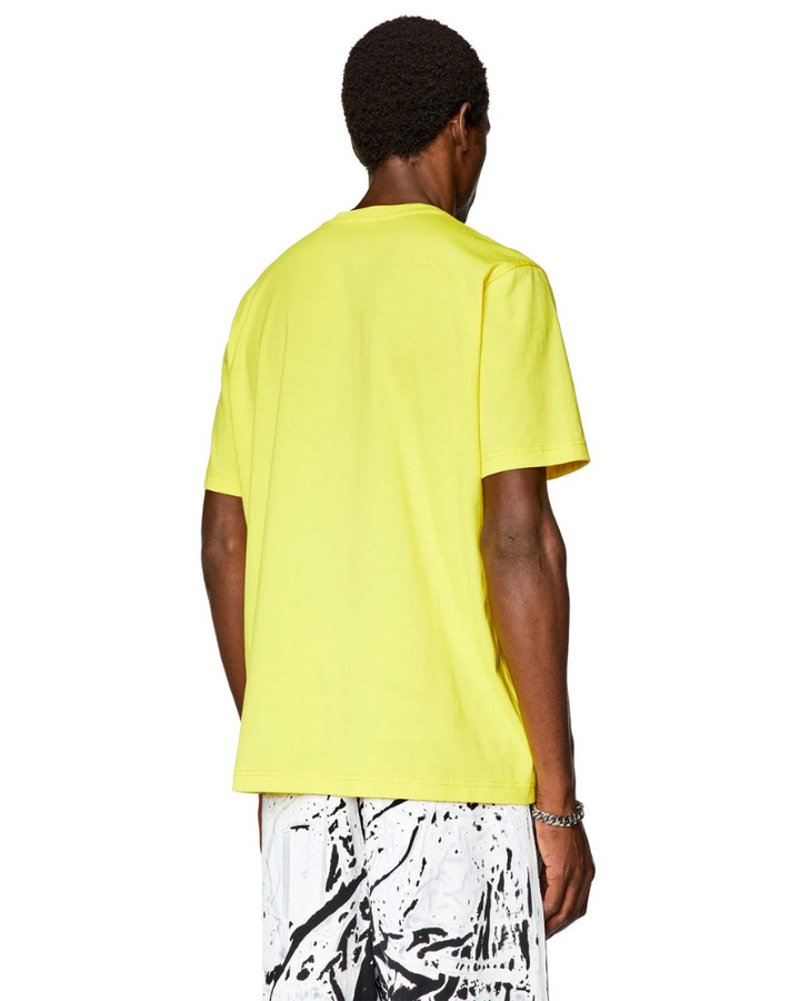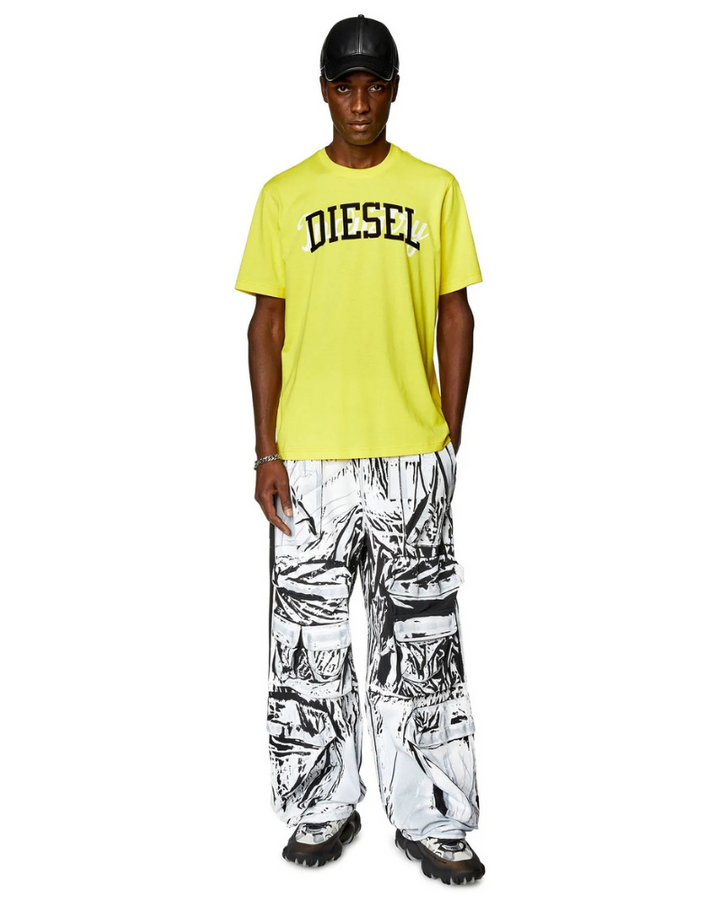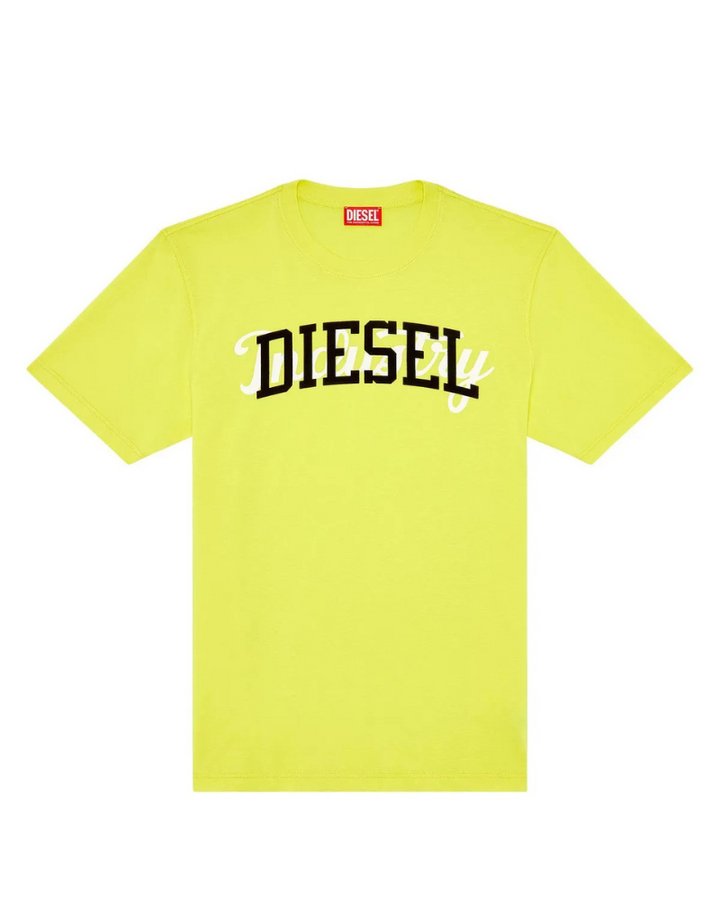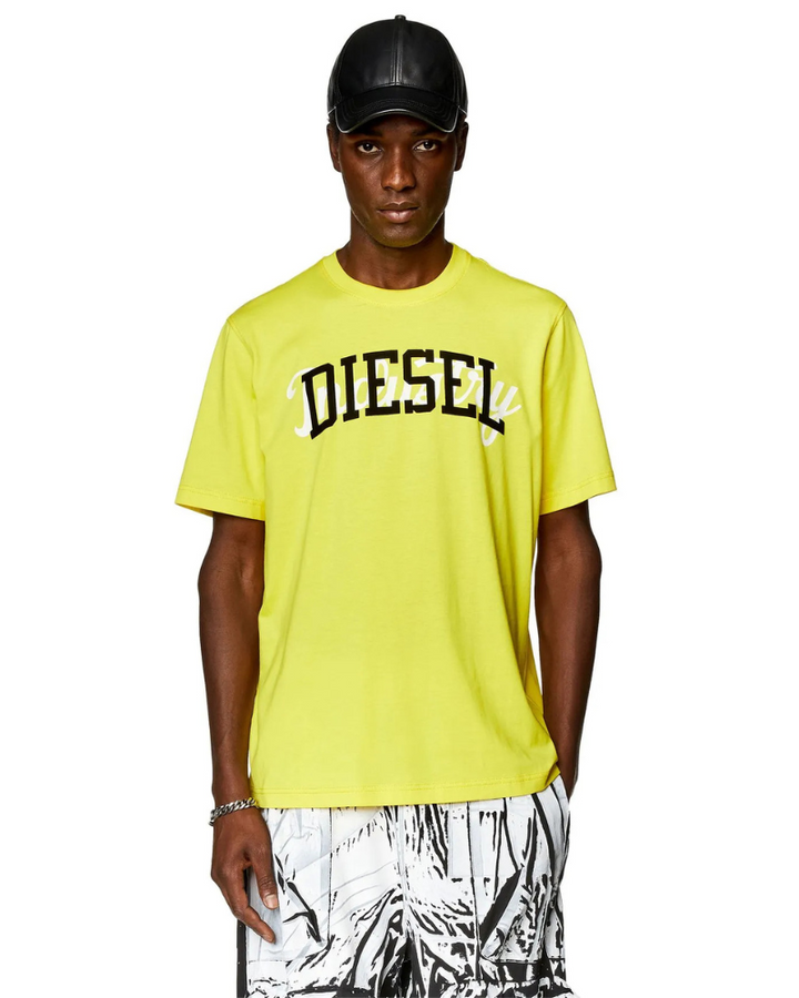 Camiseta de fit regular para hombre Confeccionada en tejido de algodón orgánico certificado. los logotipos de Diesel en bloque y en cursiva que contrastan en el pecho están estampados en una mezcla de acabados a base de agua y en relieve para lograr un efecto agradable al tacto.